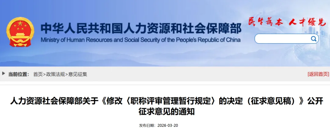 为深入贯彻落实党中央、国务院关于深化人才发展体制机制改革的决策部署,进一步深化职称制度改革,人力资源社会保障部研究起草了《人力资源社会保障部关于修改〈职称评审管理暂行规定〉的决定(征求意见稿)》,现向社会公开征求意见。公众可以通过以下途径和方式提出意见: